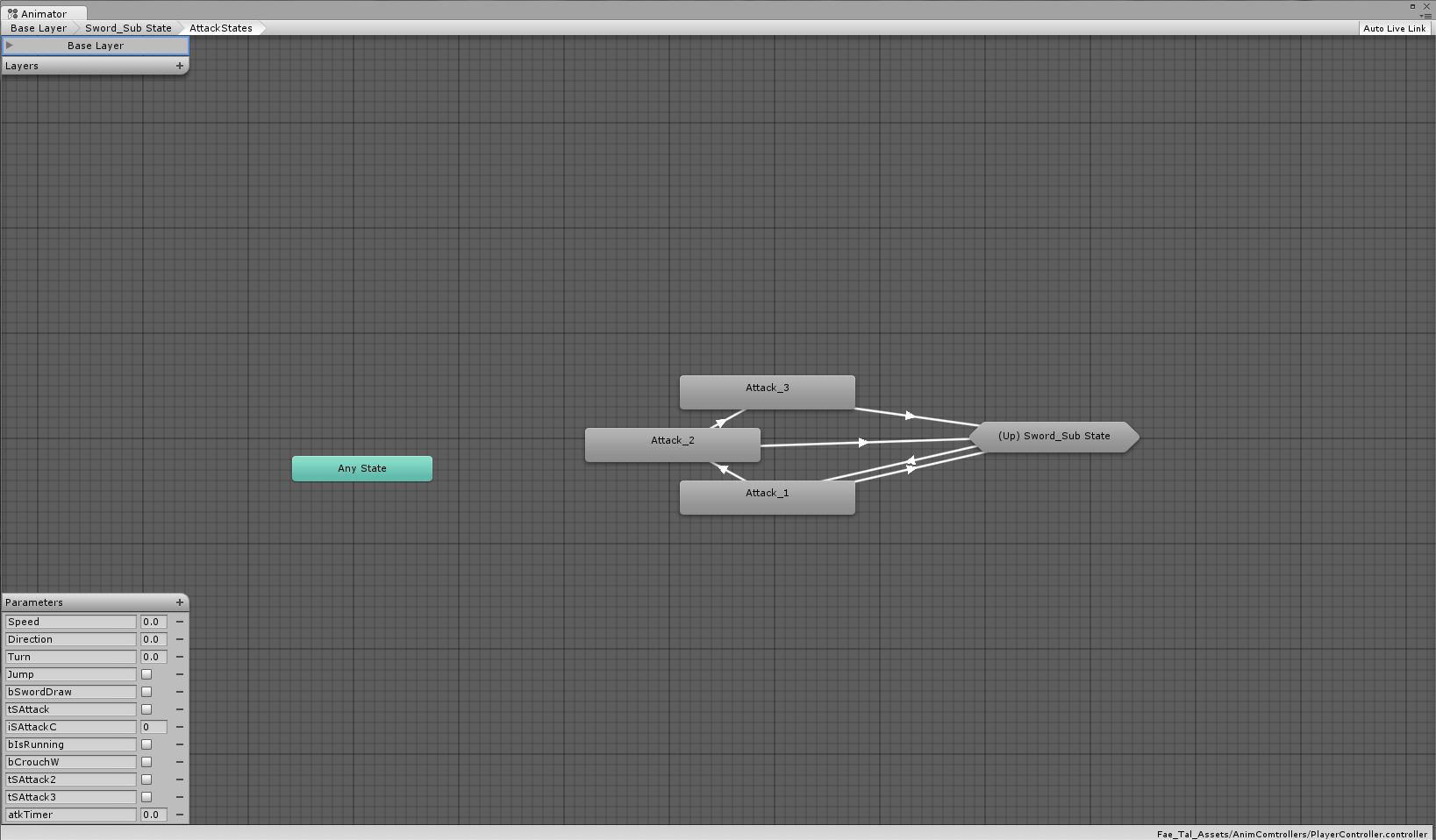 For the players attack, I wanted to show a simple combo system driven by the animation controller. Three states were created to be used to string three attacks together on button press. Though only two animations were available, animation and tranistion timing were teaked slightly to emphasise three attacks. A trigger was created to call each animation to play through script on input. The animations play time or "Exit Time" was used to transition back to an idle state and act as a timer to execute the next attack.
