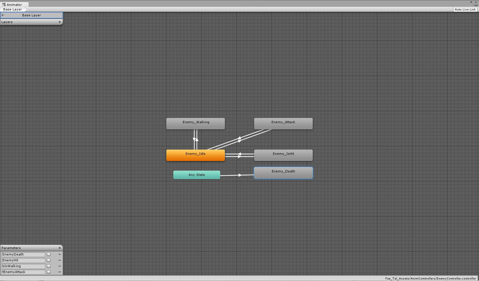 For the enemy, the animation controller only contained a few states. An Idle state to transition to walk and attack, getting hit, and a death state, set to become active at anytime the "health" script reached zero.